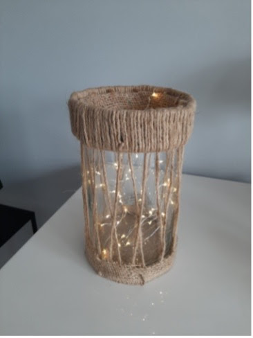 We gaan een windlicht maken van glas, touw en jute.