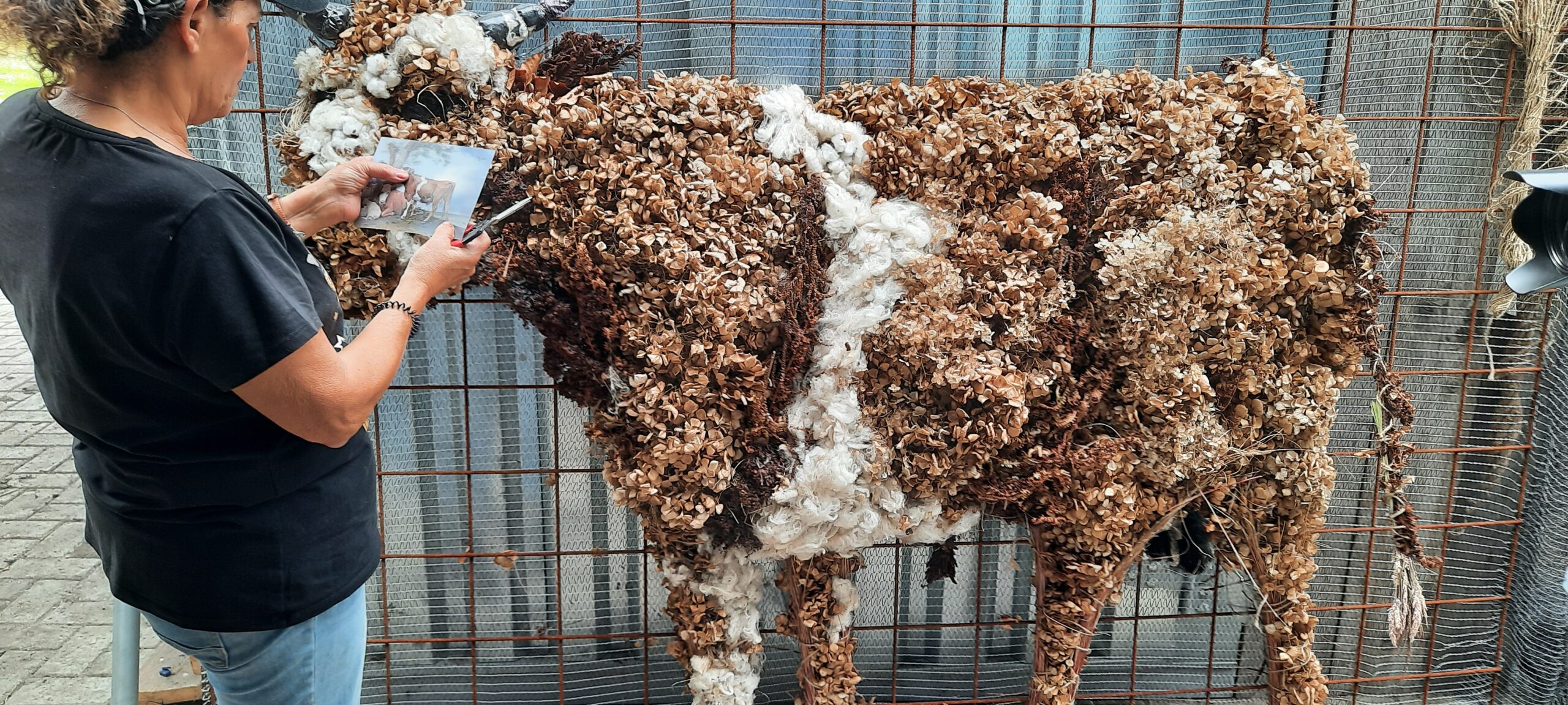 Ook The Garden wilde iets doen. Een kunstenaar maakt een koe na! van gedroogde bloemen. Deze komt op het midden terrein te staan.