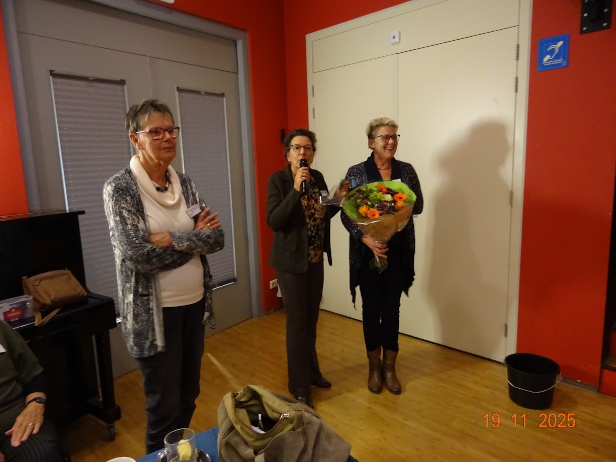 Onder onze nieuwkomers zat ook de 100-ste aanmelding en wel die van Ricarda de Jong Posthumus. Tijdens onze afdelingsavond d.d. 19.11.25 werd Ricarda hiervoor even door onze voorzitsters in de bloemetjes gezet en kreeg ze 'onze' broche opgespeld.