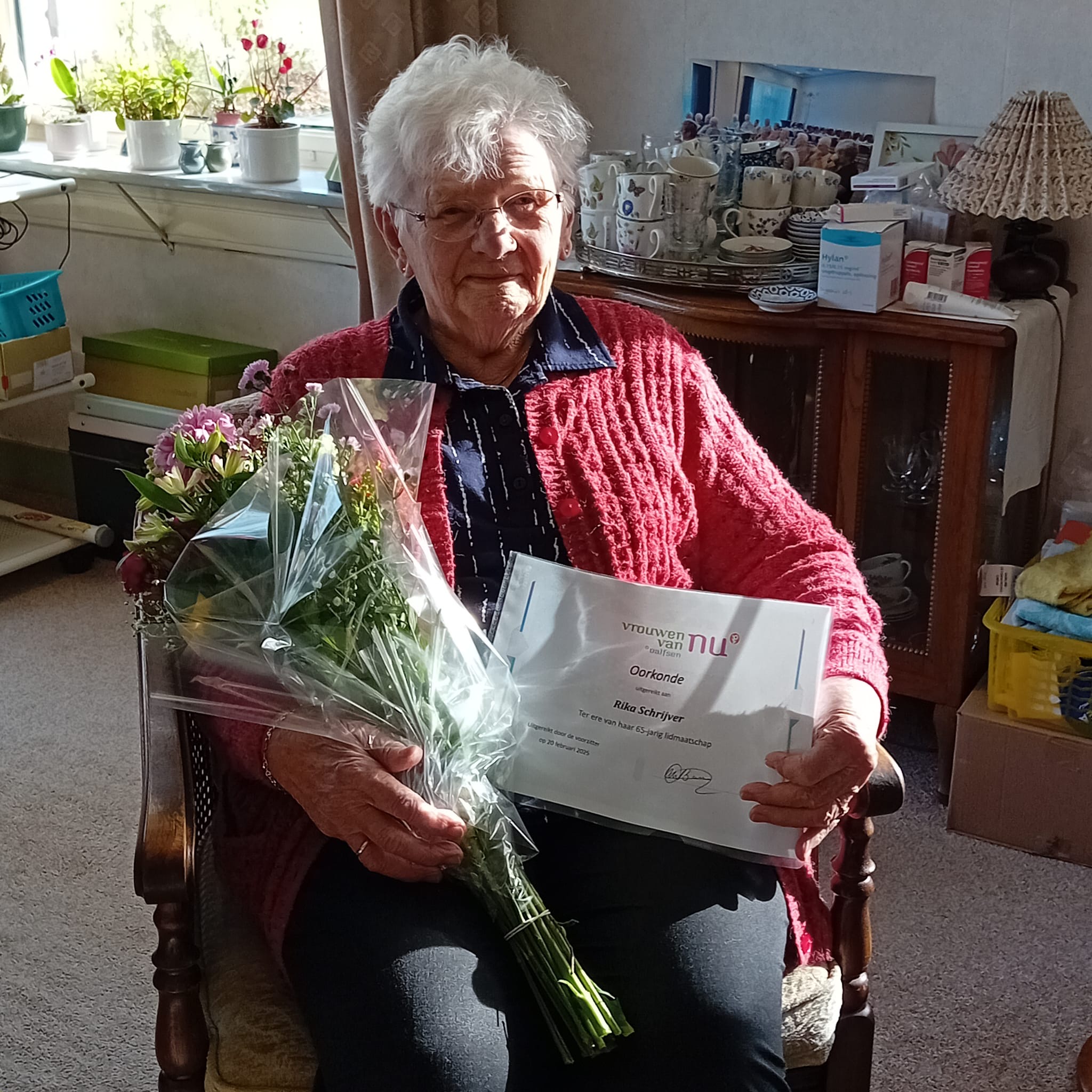 Thuis ontving de 93-jarige Rika Schrijver haar bloemen en oorkonde voor maar liefst 65 jaar lidmaatschap.