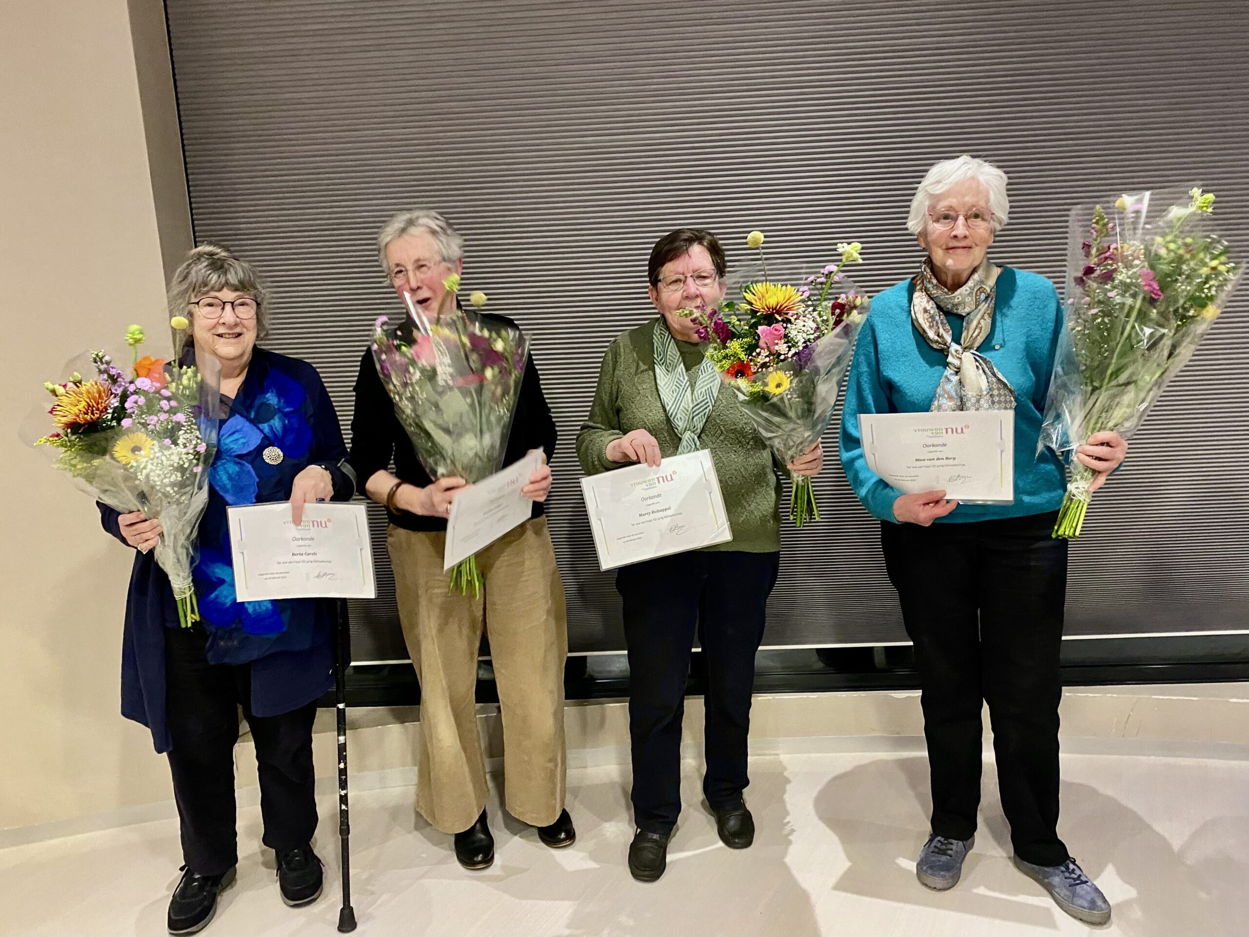Berta Carels, Evelien Fokker en Marry Holsappel, allen al 50 jaar lid, Mien vd Berg en Lies vd Kolk 25 jaar lid werden in het zonnetje gezet.