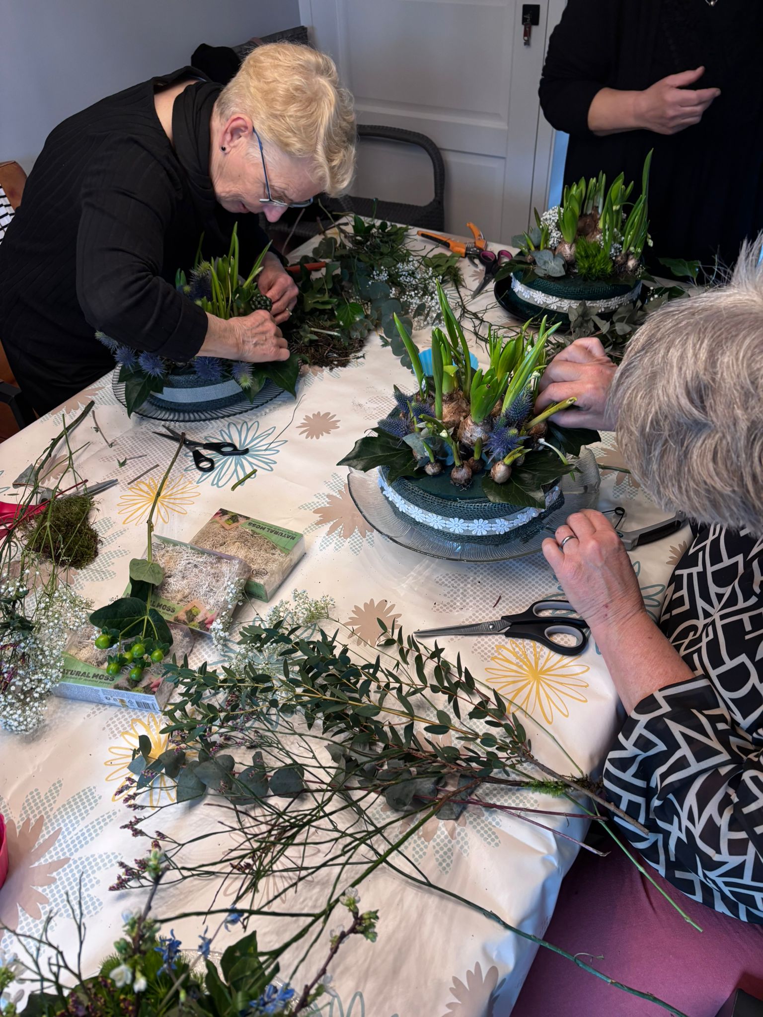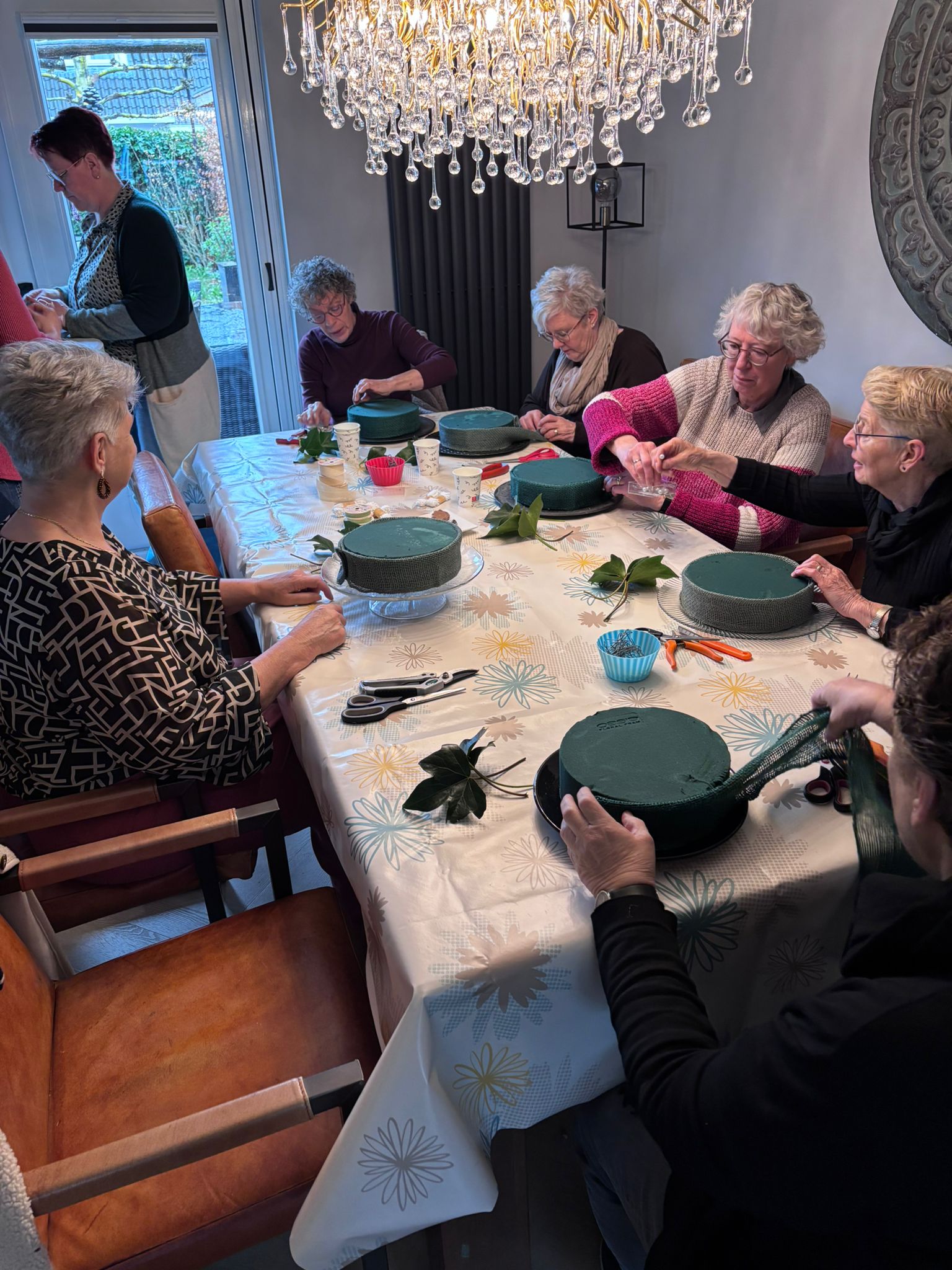 Tuinclub 4 is vandaag ook aan de slag geweest voor Pasen. Hier is gekozen om een bloementaart te maken. Michelle en Marja waren eerder al druk geweest om een voorbeeld te maken. Met wat korte uitleg kon iedereen zelf een keuze maken uit het ruim voldoende materiaal en aan de slag. Al kletsend en onder het genot van koffie/thee en wat lekkers zijn er 9 creaties ontstaan. Het was een TOP ochtend!