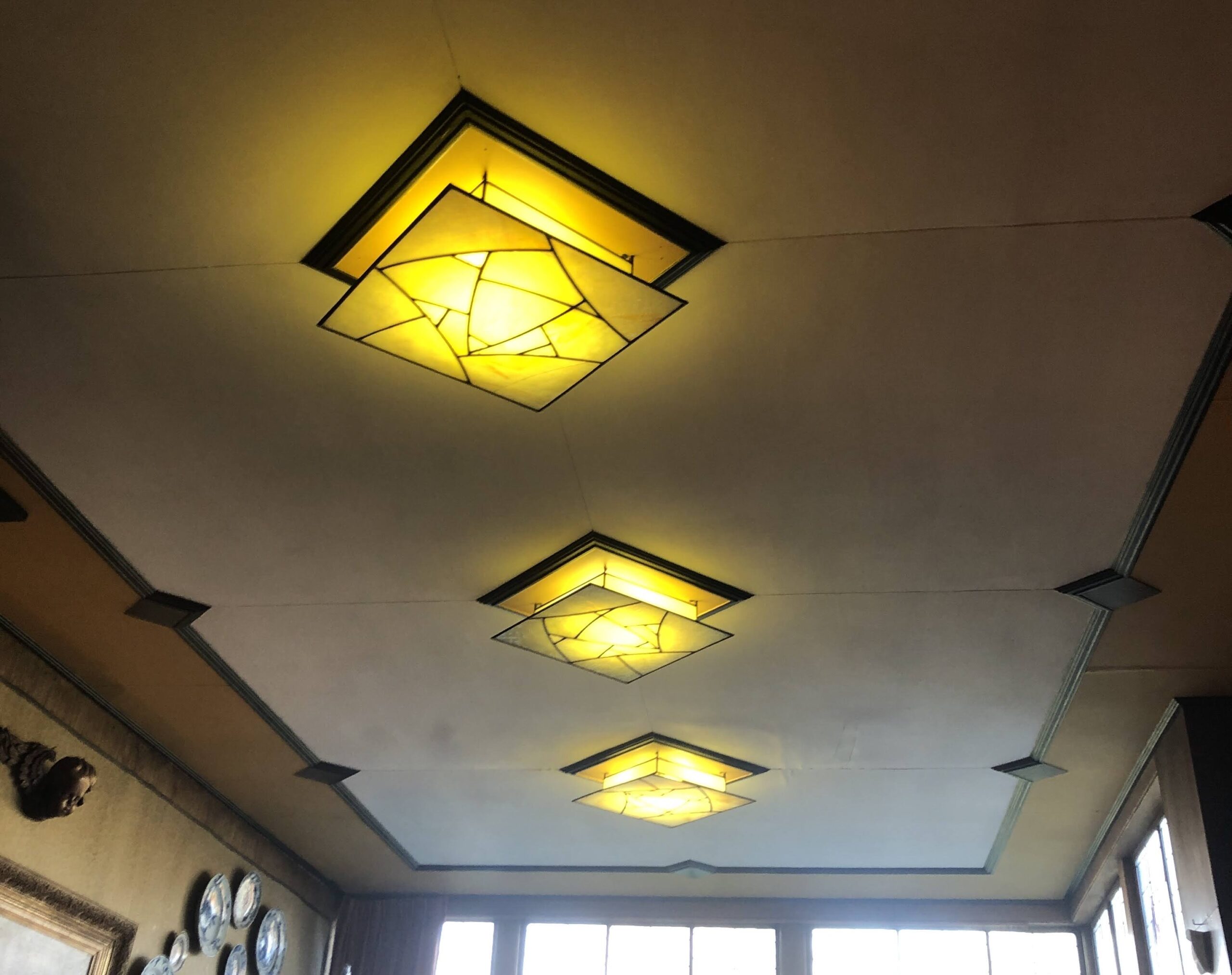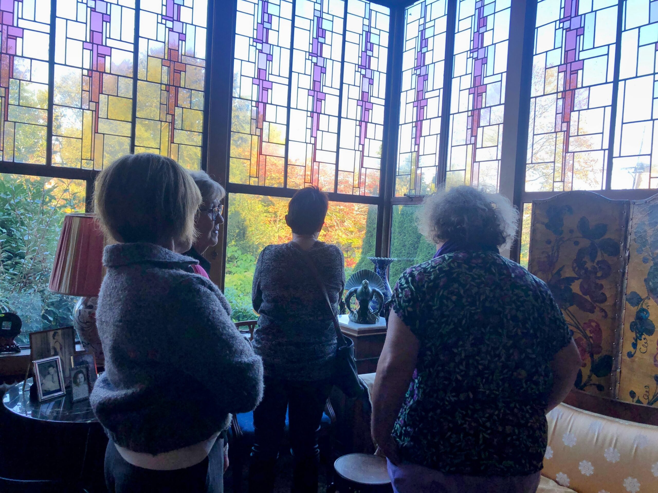 Op de eerste etage in de salon met serre, kregen we van, de vol passie vertellende, Mark veel verhalen over de kasten ( + een kijkje erin ), de plafonds met prachtige art deco lampen, het behang, het kleed, de glas-in-lood ramen en, niet te vergeten : de Auerhaen !