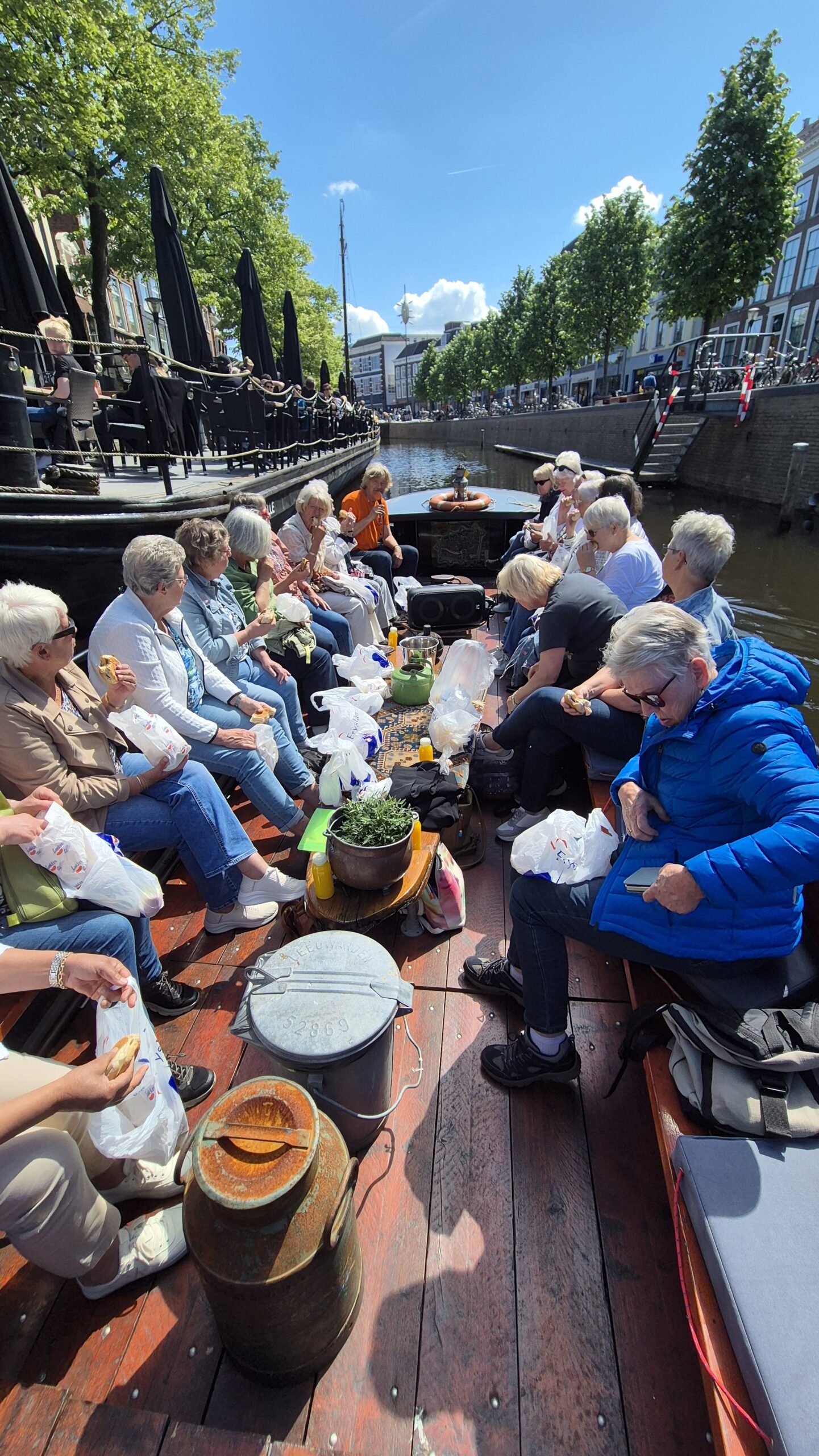 Na deze versnapering stapten we op een oude praam voor een rondvaart door de grachten van Leeuwarden. Het was echt genieten in het zonnetje op de boot. We voeren een deel door de brede gracht die om het oude centrum heen loopt. Daar tussendoor bevaarden we de kleine grachtjes door het oude centrum van de stad. De gids vertelde veel over de geschiedenis, het ontstaan van Leeuwarden en de vele mooie panden waar we langsvoeren, hij was een mooi verteller. Een lunch van broodjes met fruit en jus d'orange van de lokale bakker werd halverwege de vaart aan boord gebracht.