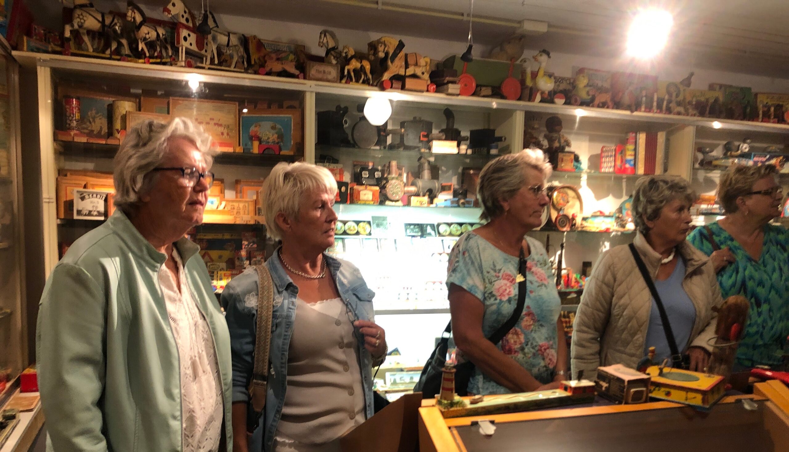 De volgende stop was bij de vlakbij gelegen SpeelgoedBank in Avenhorn. Een privécollectie van oud en antiek speelgoed, gevestigd in het huis, een oud Bankgebouw, van Nel en Ricus Leenstra. Poppen, beren, maar ook serviesjes, poppenhuizen, winkeltjes, keukentjes, fornuisjes, houten speelgoed, puzzels en spellen. Ook hebben zij een enorme verzameling blikken speelgoed van treinen, auto's en stoommachines tot toverlantaarns. Het was prachtig om te zien.