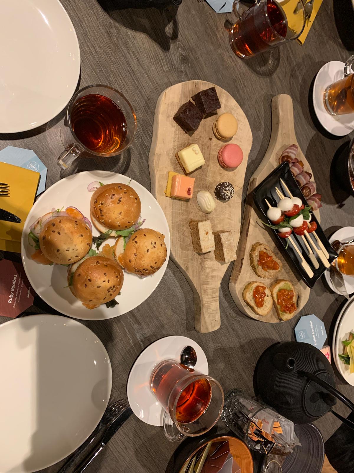 We kregen eerst een heerlijk kopje mosterdsoep met minibroodjes, daarna brownies, macarons, kokosmakronen, carrotcake, Belgische bonbons, petitfours, cheescake, bruchetta, caprese stokjes en dadels met spek.