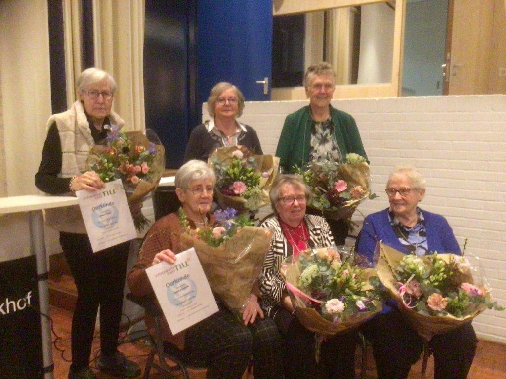 Afscheid van commissieleden. 5 dames nemen afscheid. Zij krijgen een cadeaubon als dank voor hun inzet.