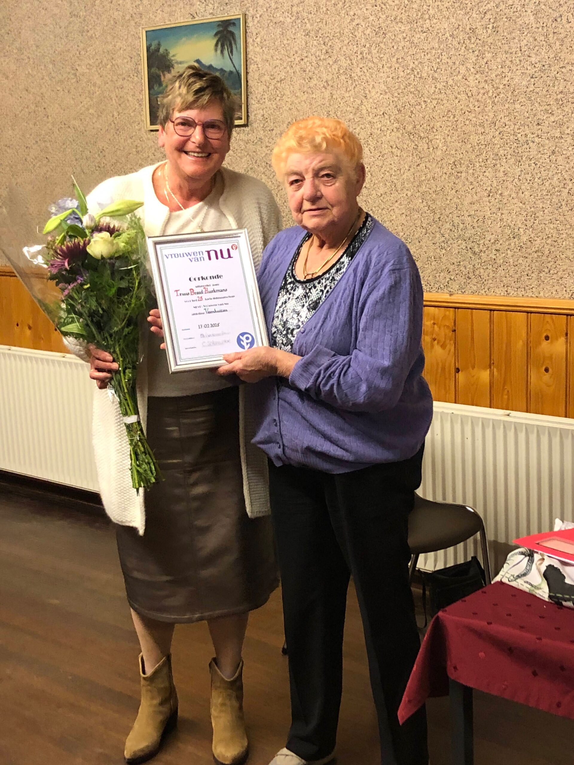 In de Jaarvergadering werden alle zaken weer grondig doorgenomen en tot ieders tevredenheid afgesloten. Truus Breed werd gehuldigd, zij is 25 jaar lid.