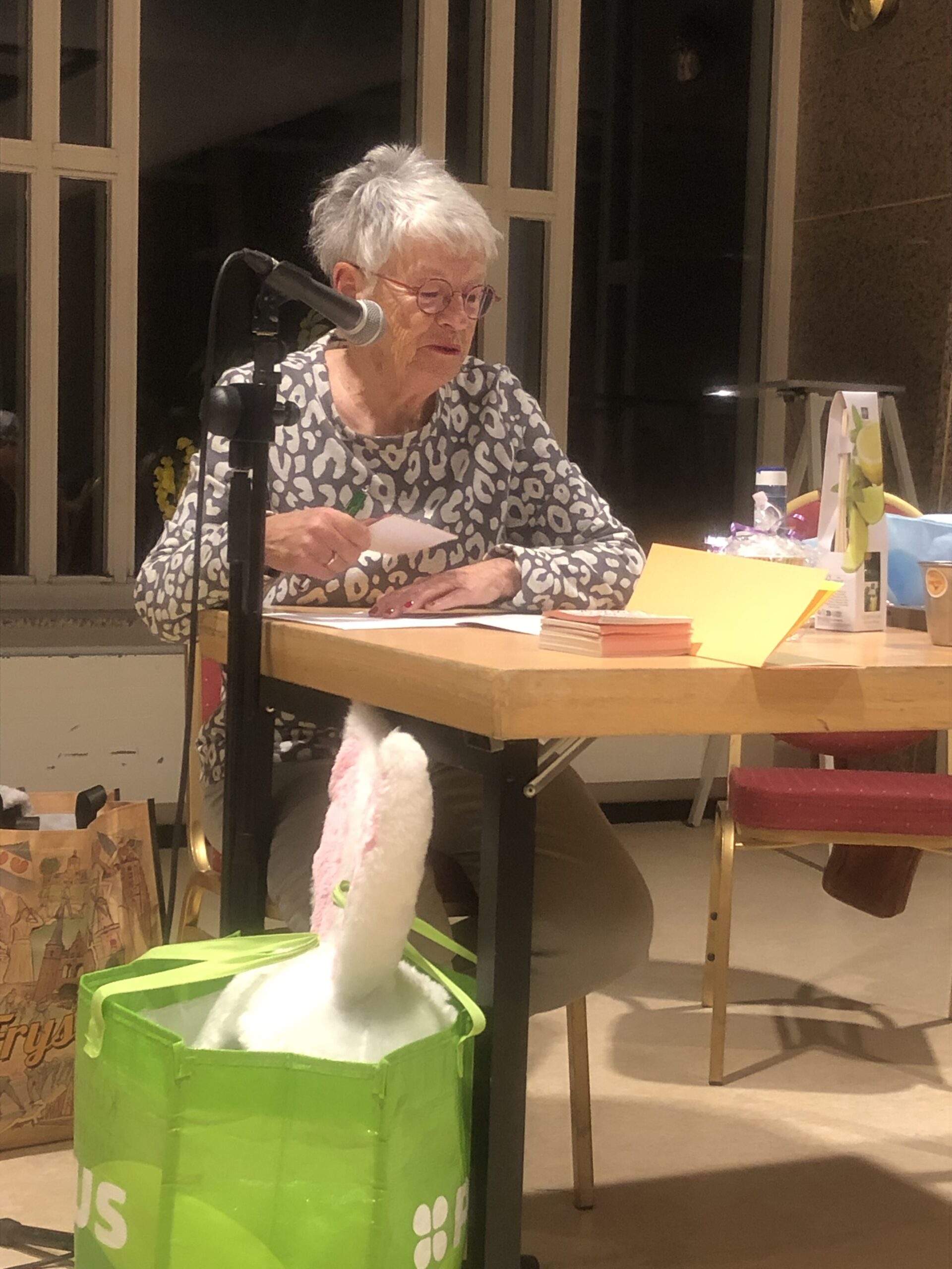 Na uitgepeld te zijn ging ze achter de microfoon zitten om een verhaal van de Paashaas familie voor te lezen, ondertussen moesten de dames goed opletten omdat er bingo cijfers in het verhaal verborgen zaten. Na 3 rondes was het verhaal nog niet afgelopen maar was de bingo kaart bij Harmke vol. Dus hoe het verhaal afloopt ? vast goed.