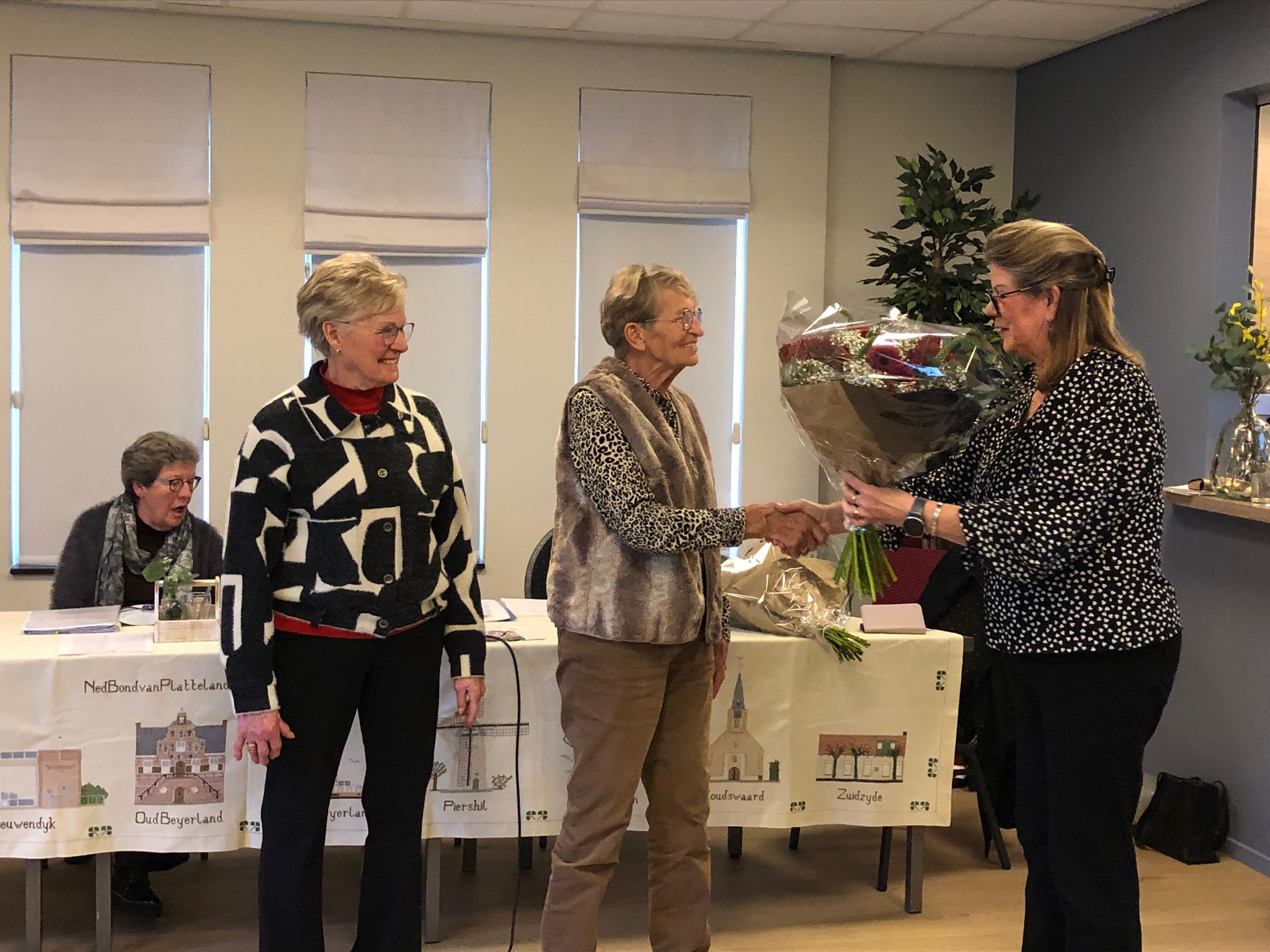 Jubilarissen Pieta Berkhout en Corrie Kruythoff beiden 50 jaar lid bij onze vereniging. Dat is wel een bloemetje en felcitatie waard.