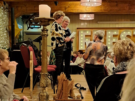 De kerstmiddag was goed bezocht en de locatie Bloemenlust te Breezand sfeervol aangekleed en vooral aangenaam warm. De muzikale omlijsting van de lunch was in goede handen bij Sandra Mooy. Helaas had de cateraar van vorig jaar dit jaar geen tijd, waardoor we blij waren dat Lydia de Loos de catering op zich nam.