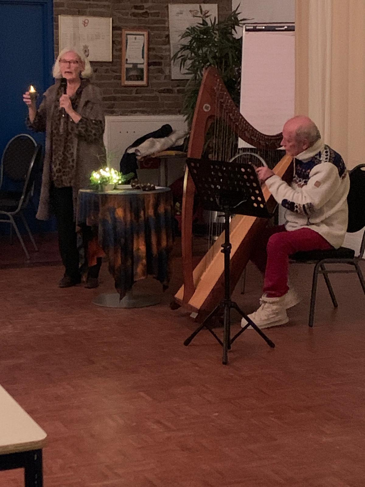 De voorzitter opent deze bijeenkomst met een woord van welkom aan onze gasten en een korte kerstgedachte. De zaal is feestelijk versierd met kerststukjes met vele kleine lichtjes. Na de koffie/thee met wat lekkers krijgen onze gasten het woord: Jeanet Landman en Paul de Haas. Zij vertellen afwisselend midwinterverhalen. Engbert de Leeuw speelt tussen de verhalen door op de Keltische harp en hij begeleidt de verhalen van Jeanet met mooie achtergrondmuziek.