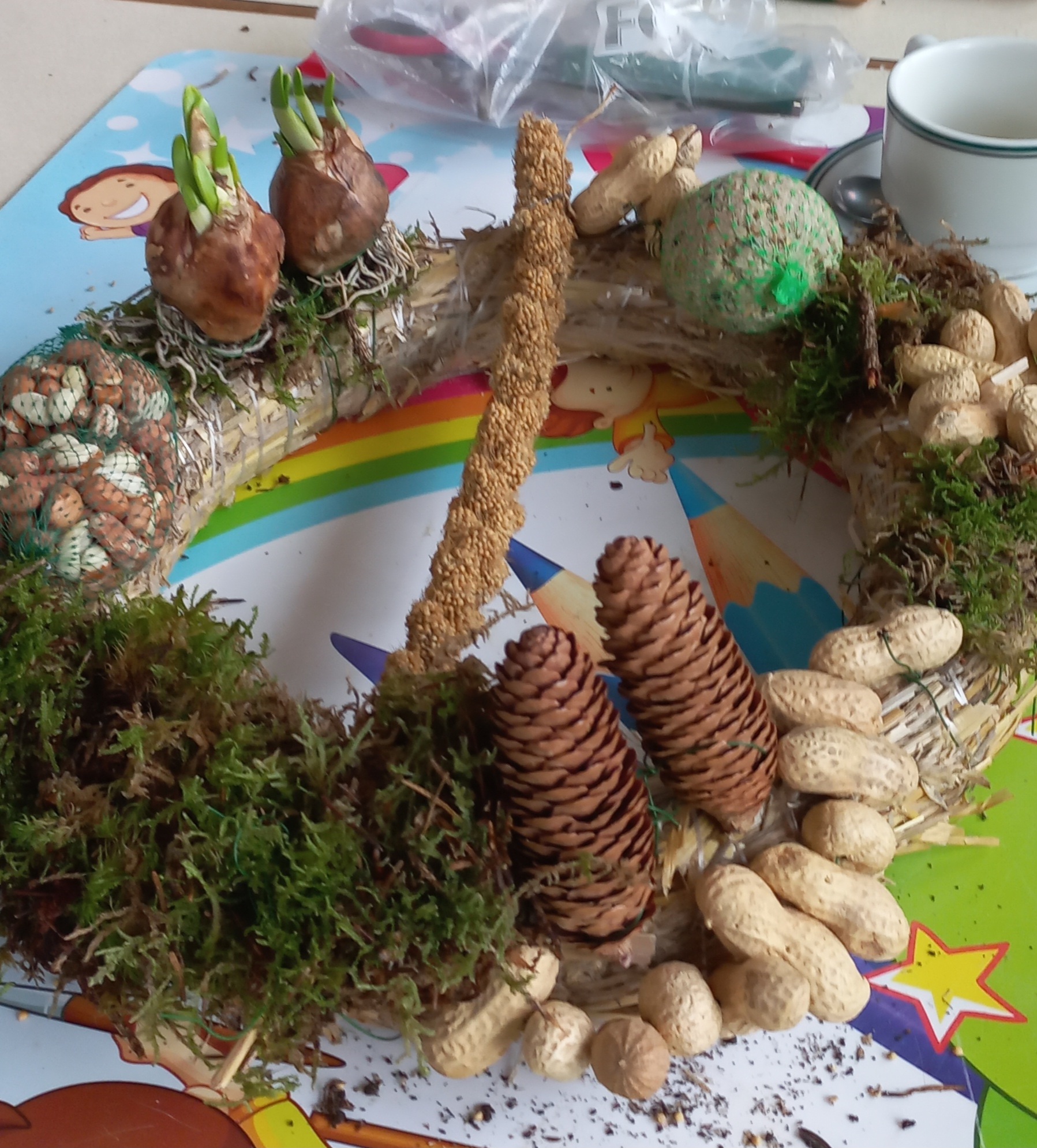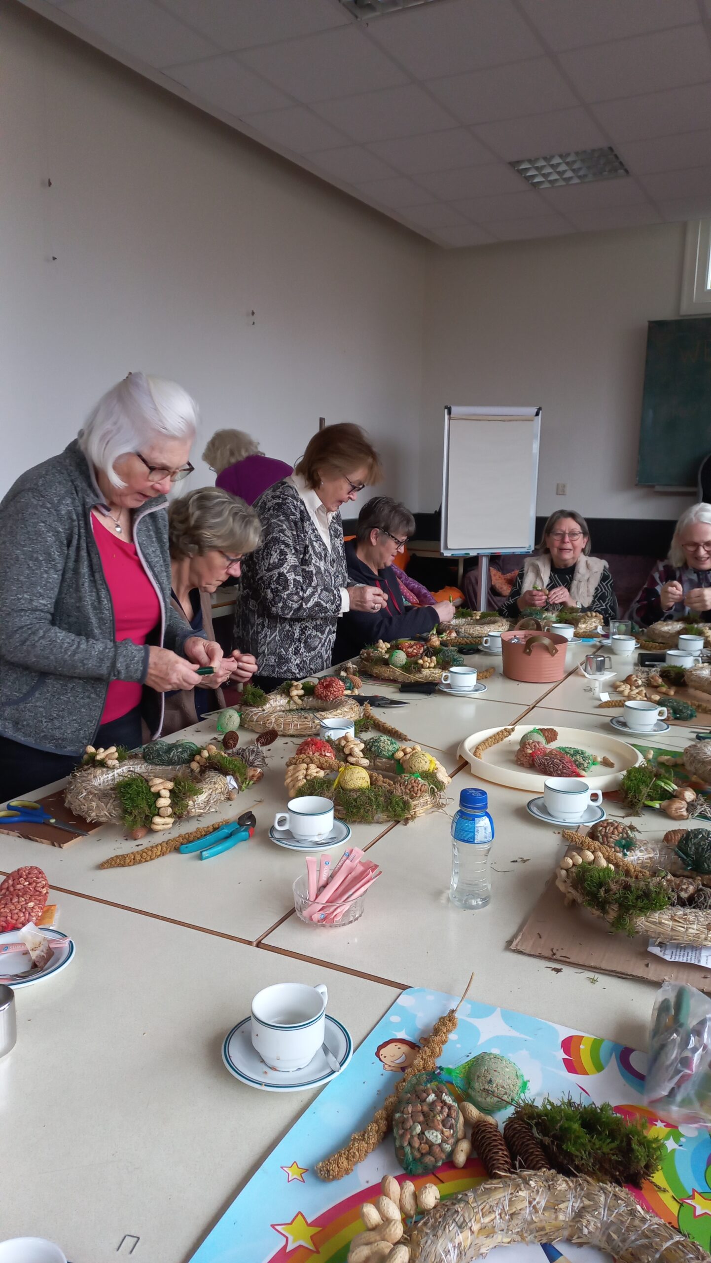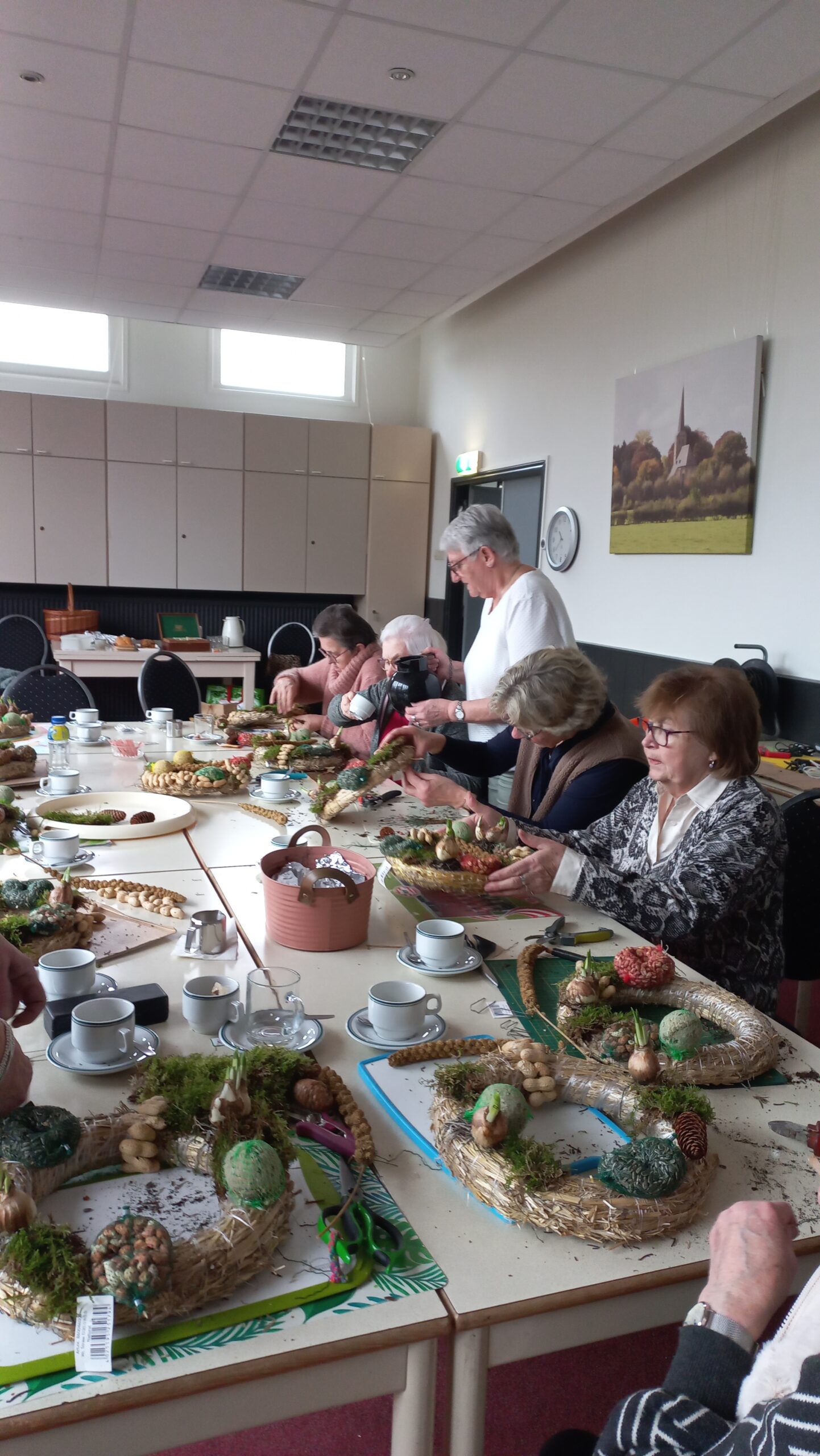 We gaan een vogel voederkrans maken. De zaal is klaargezet in de Voorhof, de koffie gezet, de cakes gebakken en alle materialen zijn aangeschaft en klaargelegd, als tegen kwart voor 10 de eerste deelnemers binnen komen.