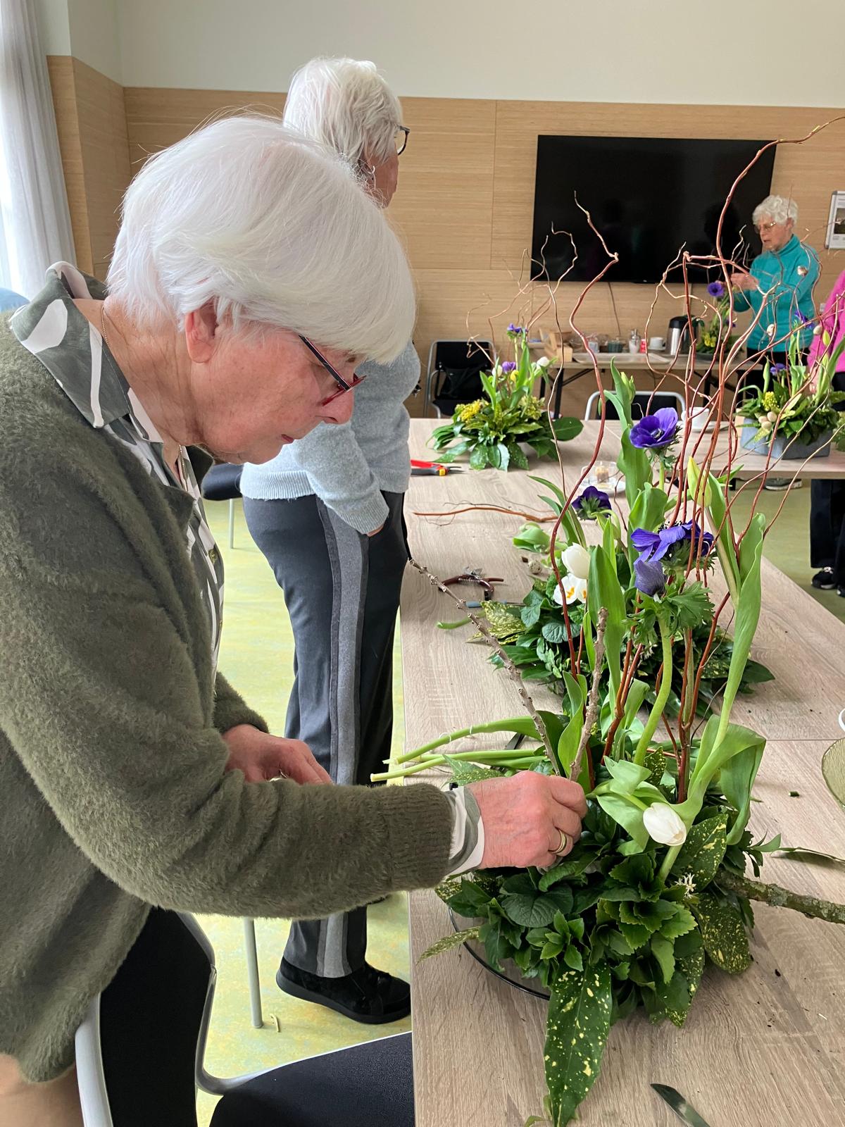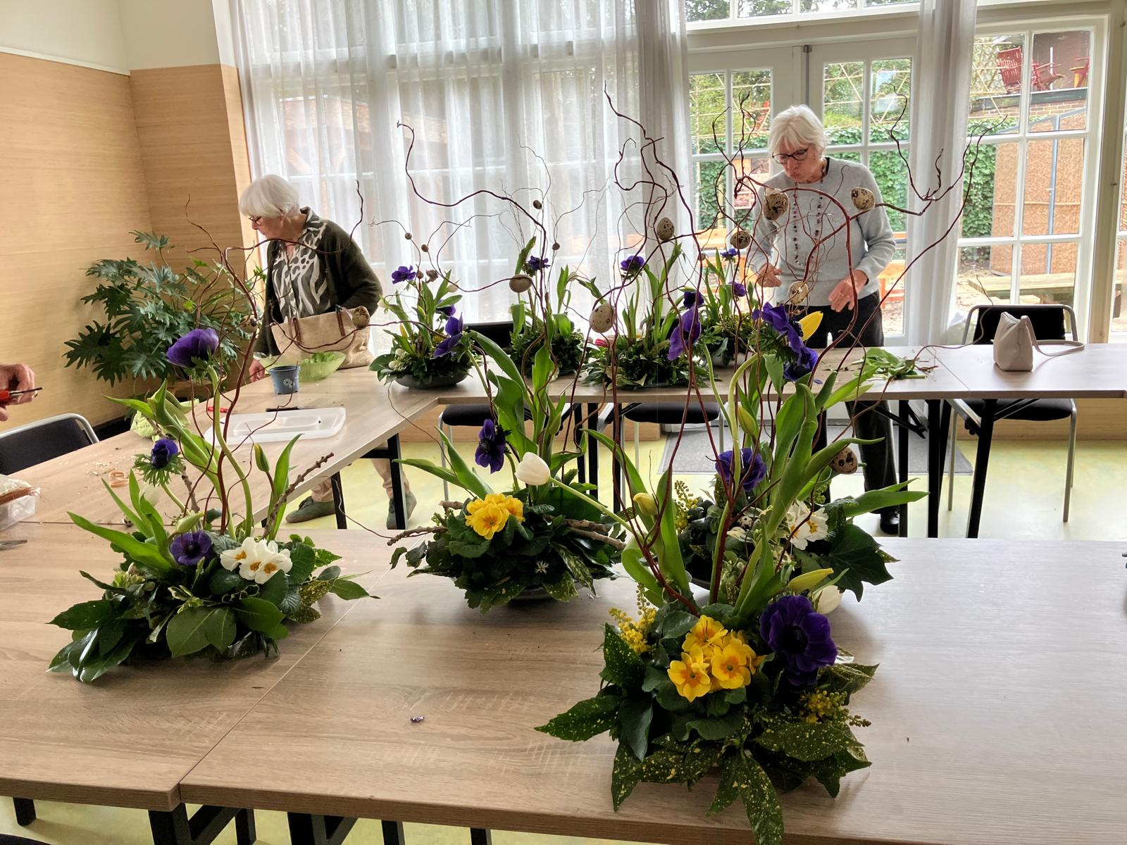 Vandaag is ook tuinclub 2 'Vrouwenmantel' creatief bezig geweest met een paasstuk. Jikky Urff en Gerry Mol hebben de workshop gegeven. Beide hebben een avond voor de workshop het paasstuk thuis gemaakt. Hierdoor waren er voor de 8 deelnemers mooie voorbeelden en hadden Jikky en Gerry de handen vrij om en de anderen te helpen waar nodig. Door veel groen uit eigen tuin, aangevuld met wat bloemen en oases, konden de kosten laag worden gehouden. Het paasstuk kost voor de deelnemers € 9,20. Wat een prachtige eindresultaten!
