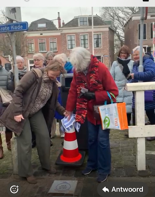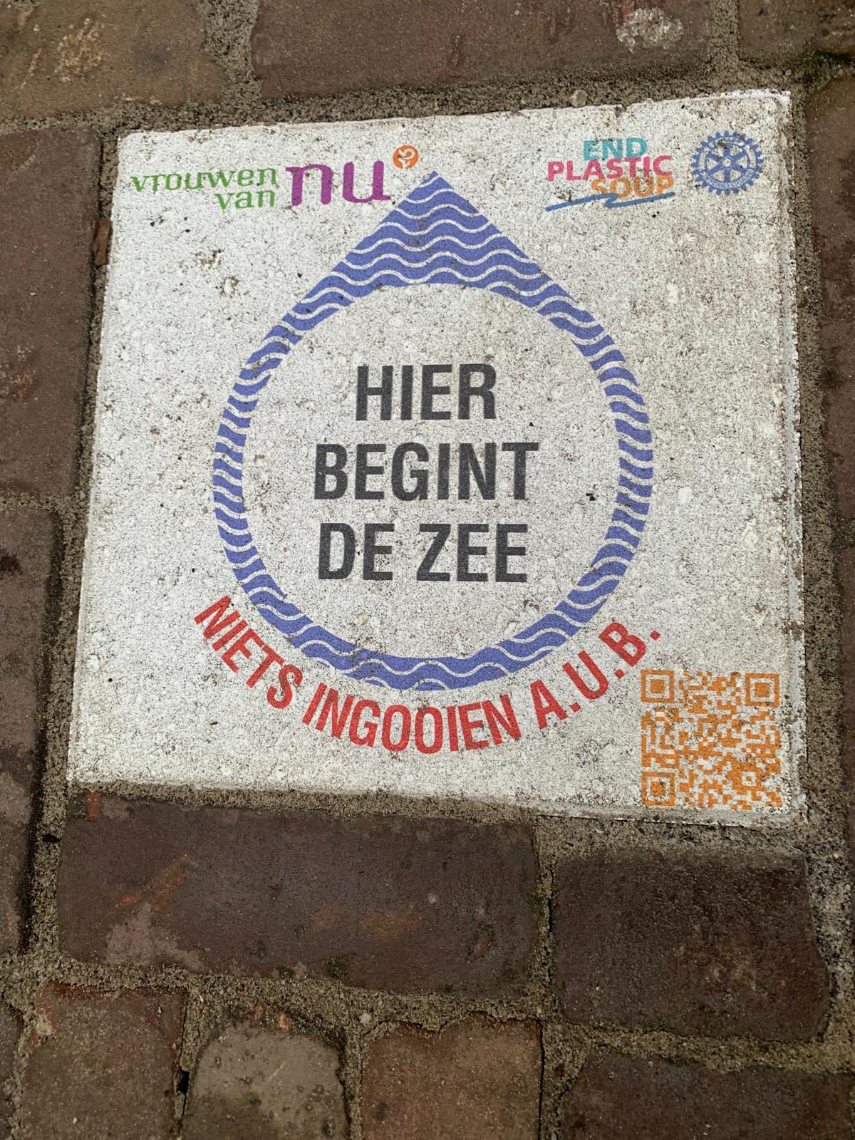 Nyenke Groen en de Wethouder van Goes Joan Veldhuizen hebben samen de tegel “hier begint de zee- niets ingooien aub” onthuld bij de haven van Goes