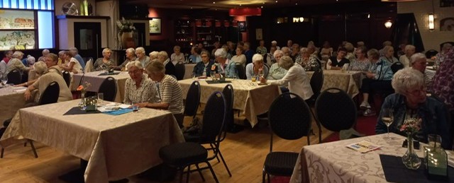 Voor de startavond melden zich 76 vrolijke vrouwen: fijn, het-begint-weer. Traditiegetrouw presenteren de commissies en interessegroepen op deze eerste avond hun plannen. Het is dringen bij de info-tafels. Binnen een kwartier is het theaterbezoek volgeboekt en ook de stadswandeling ‘loopt’ prima. Voor de tuinclub is veel interesse en de leeskring krijgt een nieuw lid. Dan met de koffie naar de zaal en luisteren naar Nicolet Steemers, schrijver van misdaadromans. Ze vertelt over de moord op de boekhandelaar en de zes mogelijke verdachten. Opdracht aan ons: wie is de dader, wat is het motief, wat is het bewijs. We piekeren, overleggen, wikken en wegen en…..uiteindelijk heeft alleen Hetty het volledige mysterie ontrafeld, gefeliciteerd!!