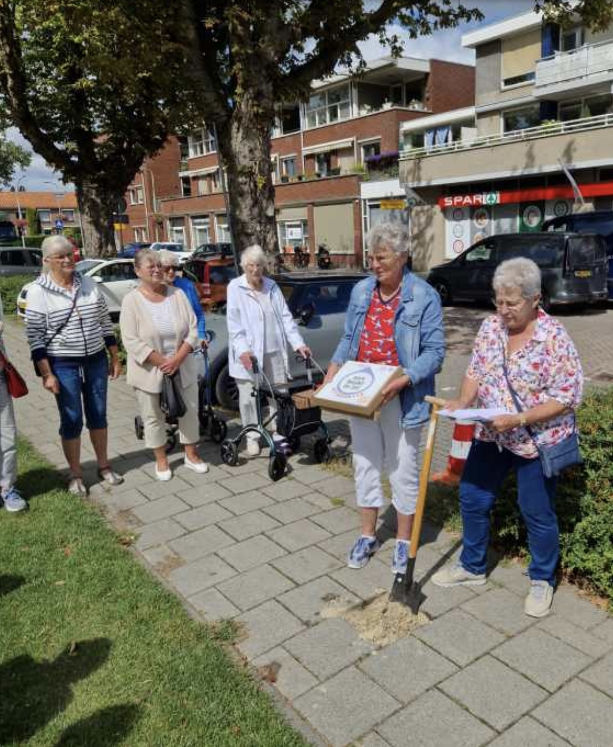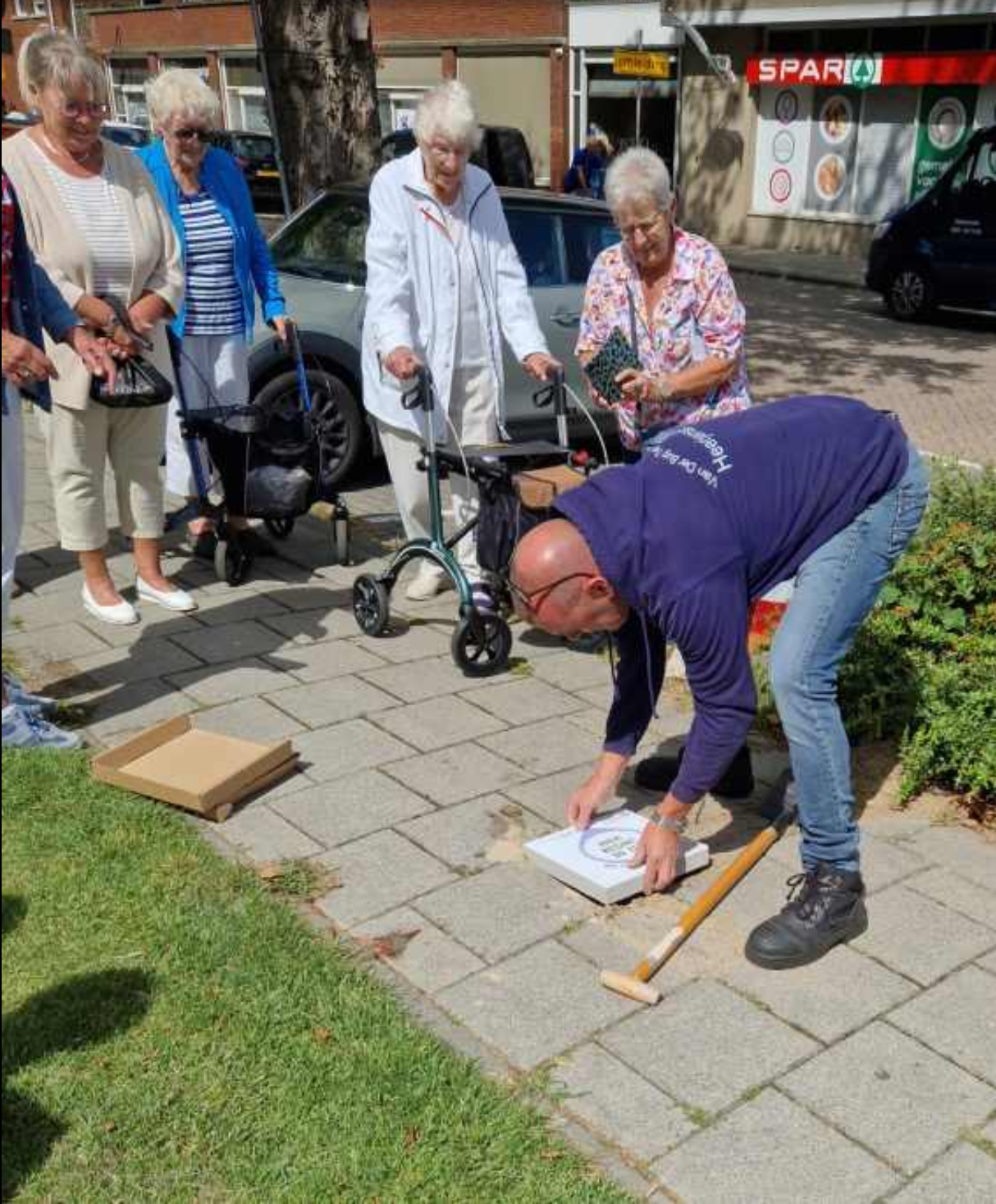 Een afvaardiging van de dorpsraad was ook aanwezig bij dit speciale moment. Aan dorpsraadslid René van der Burg de eer om de tegel op zijn plek te leggen. U kunt de QR code op de tegel scannen voor meer informatie over dit onderwerp.