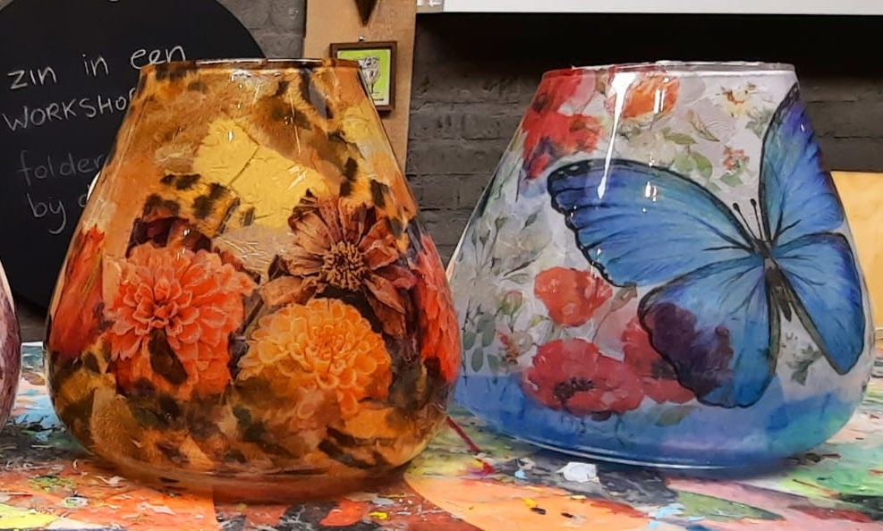 Je krijgt een mooie transparante, glazen vaas en maakt vervolgens een collage van de servetten die je leuk vindt. Er is heel veel keus. Het eindresultaat is verbluffend.